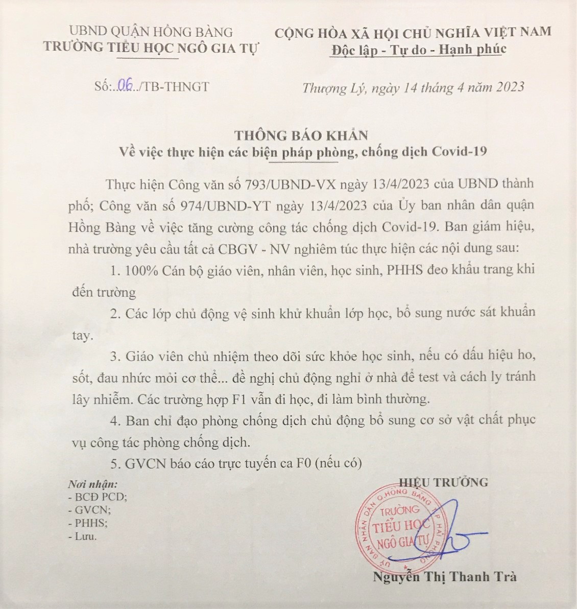 giám hiệu, nhà trường yêu cầu tất cả CBGV – NV nghiêm túc thực hiện các nội